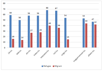 Regarding the 2 labels, we assumed that, while the pro-government media would use the label ‘migrant’ more often, the non-pro-government media would more frequently use the label ‘refugee’ – i.e. while the MPB would use the term with negative connotations to increase the level of threat, non-pro-government media outlets would not use such a labelling technique. Figure 1 shows that there is, indeed, a significant difference between the non-pro-government media (the first 7) and the pro-government (the last 2) media, although the labelling technique meant increasing the use of the term ‘migrant’ but not avoiding the term ‘refugee’ (Figure 1).