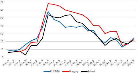 Figure 4. The level of fear from migration for the EU in Hungary, in Poland and in the EU, 2012–2023*