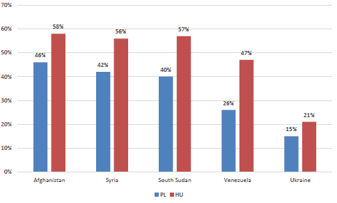 Figure 7. The proportion of those who totally or somewhat oppose the statement: ‘To what extent would you support or oppose allowing more refugees into Hungary/Poland from …?’ (%)